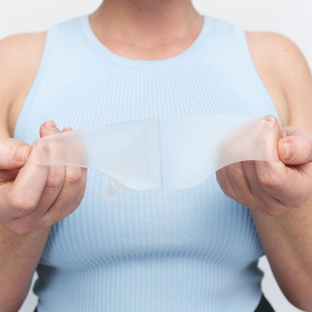 Retire a base protetora da plaquinha, coloque-a com o lado que gruda para baixo e alise-a sobre a pele.